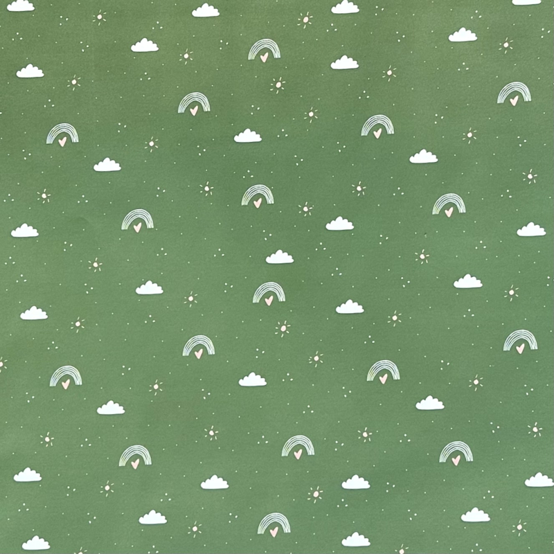 Cadeaupapier van Nynke Ontwerpt met regenboogjes, wolkjes, zonnetjes en hartjes in groen met wit en roze details